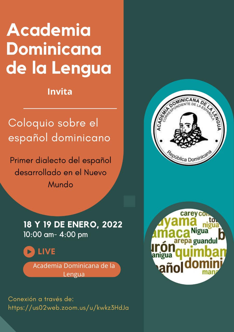 Coloquio sobre el español dominicano: primer dialecto del español desarrollado en el Nuevo Mundo 18 y 19 de enero | 10:00 a. m. a 4:00 p. m. Conexión a través de Zoom y transmisión en vivo por la cuenta de la Academia Dominicana de la Lengua (ADL).